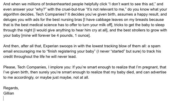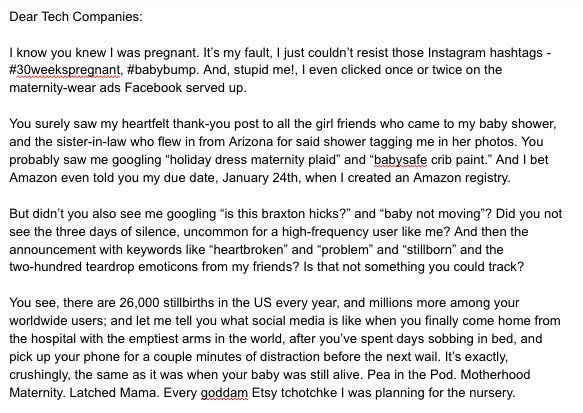 More broadly--people talk about self-driving cars and the ethics behind it. There it is life and death so it’s more obvious how we wouldn’t necessarily just want it up to the discretion of computer code who lives/dies. But ethics touches all parts of tech and anytime you have created a rule for decision making that isn’t overseen by humans—you’re gonna run into problems. And our intuition for how ethics should work also gets jammed up because it’s easier to think about the case of how to treat and respond to an advertising agent who puts a billboard for caskets outside of a hospice, but less clear when it was done through some complex algorithmic decision-making process.